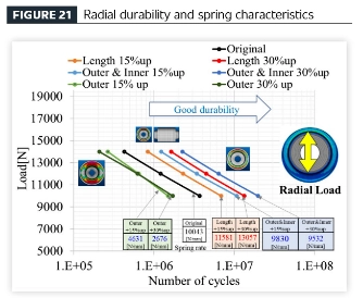 За гумене вибрационе изолаторе, захтеви за перформансе могу имати за циљ постизање оптималне равнотеже између издржљивости радијалног оптерећења и издржљивости на торзију, или торзиона издржљивост може бити од посебне важности. Што се тиче карактеристика опруге, док је мекша опруга често пожељна за буку, вибрације и удобност вожње, релативно чвршће опруге су понекад неопходне да би се осигурала прецизност управљања и стабилност возила. Пошто се подаци о дизајну компоненти са дефинисаним атрибутима перформанси бирају у складу са циљевима перформанси целог возила—и ови атрибути су суштински повезани са димензионалним параметрима—димензије компоненте могу бити реверзно пројектоване почевши од жељених метрика учинка. Овај приступ омогућава да се утврде циљеви перформанси током почетне концептуалне фазе развоја возила, чак иу одсуству детаљних цртежа, и омогућава да се приближни распореди гумених компоненти изведу на основу очекиваних перформанси. Коришћењем овог каталога перформанси, димензије компоненти се могу одредити од самог почетка у складу са спецификацијама перформанси – елиминишући потребу за понављајућим ФЕМ анализама, избегавајући итерације дизајна и прераду током детаљних фаза развоја, и олакшавајући брзу имплементацију планирања високе прецизности.