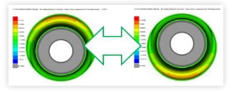 На следећој слици је приказан модел коначних елемената специфичне чауре за вешање под радијалним оптерећењем и контурни приказ резултата прорачуна.