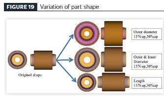 [Успостављање ефикасног процеса дизајна производа возила кроз технологију анализе замора] Применом предложене технике анализе замора за гумене компоненте које изолују вибрације, спроведена је параметарска студија на компонентама направљеним од истог материјала како би се истражио однос између геометријских варијација (запремина гуме) и перформанси издржљивости. Геометрија компоненти је изведена из оригиналног дизајна дела, са моделованим варијацијама укључујући: