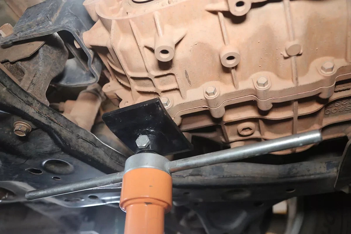 На нашем демо возилу постоје урези за подршку који закључавају носач у носач за монтажу мењача. Морали смо да применимо додатно подизање да бисмо ослободили носач.